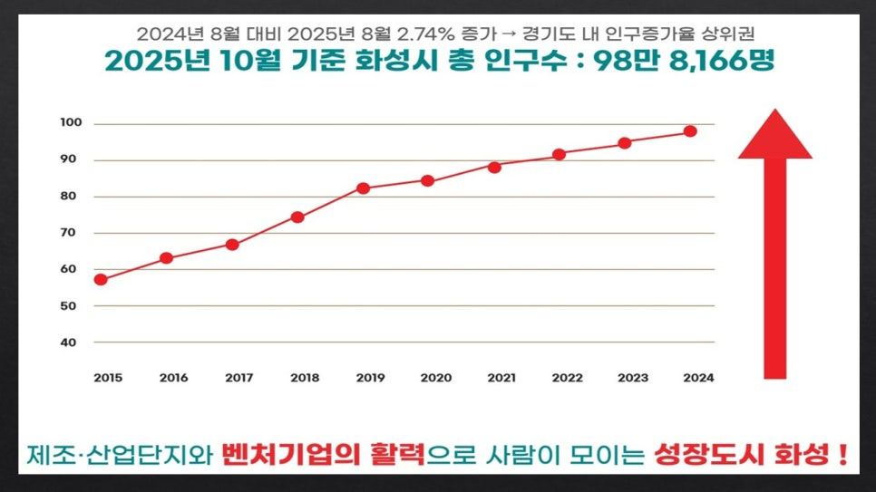 화성시는 지속적으로 인구수가 증가되고 있는 도시이며 앞으로도 계속 증가될 것으로 예측하고 있습니다. 화성시는 주변 산업단지가 밀집되어 있어 일자리 창출도 꾸준히 늘어나고 있어 주거시설이 부족한 상황입니다. 그러므로 인구 증가에 따른 부동산 가치가 꾸준히 오르는 곳으로 주거와 투자가치가 높은 곳입니다.